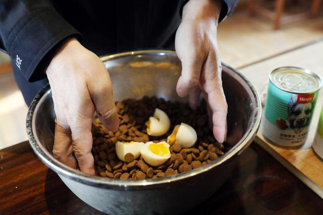 黄庆喜用狗粮奖励正在进行障碍环境训练的拉布拉多幼犬。