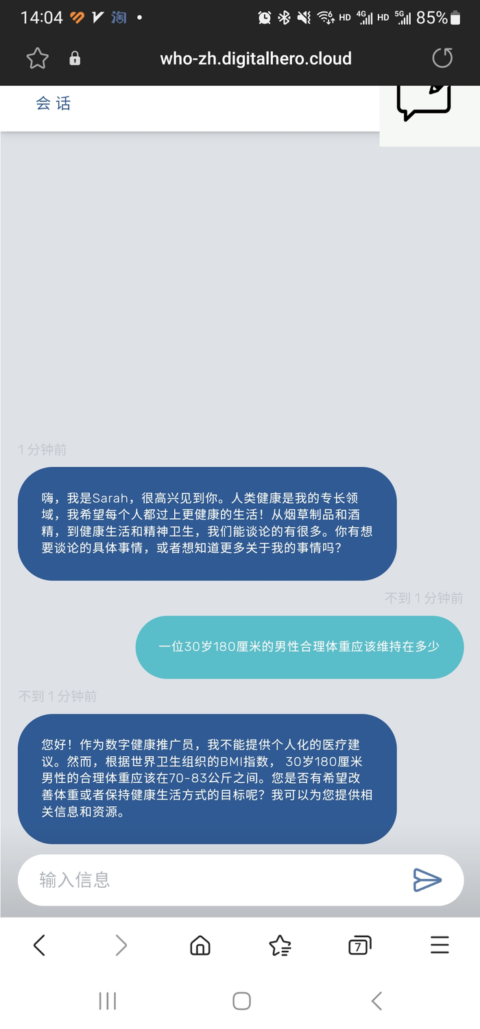 而在回答方面,SARAH目前确实能回答一些健康方面的简单咨询。例如在询问一位30岁180厘米的男性合理体重应该维持在多少时,SARAH根据世界卫生组织BMI指数给出的回答是70-83公斤之间。