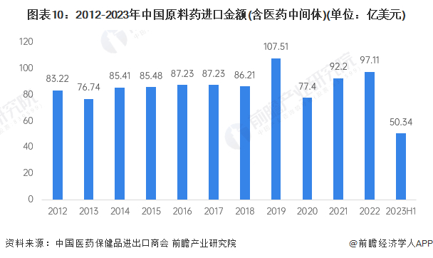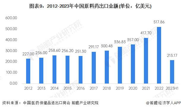 从进口市场来看,2012-2019年,中国原料药进口规模呈波动态势,整体波动较为平稳。2020-2022年受疫情影响,我国原料药进口量有所下跌。2023年上半年,中国原料药进口额为50.34亿美元,同比增长5.3%。