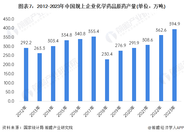 化学原料药是药品生产的基础原料,直接影响药品的质量和产能。由于传统大宗原料药技术门槛低,国内传统大宗原料药生产企业数量在前期呈现出高速增长。据国家统计局数据,我国化学原料药产业曾经历了长期快速发展阶段,产量规模一度上升至超过350万吨,导致国内现阶段传统大宗原料药产能过剩,2018年开始,国内传统大宗原料药产量开始下降,2018年国内规上企业原料药总产量降至230.37万吨。2019-2023年,中国原料药供给产量有所回升,2023年回升至394.9万吨。