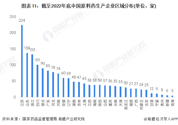 从生产企业区域分布来看,原料药生产企业数超过100家的有4省,分别为江苏(224家)、山东(138家)、浙江(133家)、四川(101家),4省合计占全国原料药企业总数的近四成(37%)。其中,江苏地区原料药企业最多,占全国总数的14%,其次分别为山东和浙江,原料药生产企业数量分别为138家和133家。