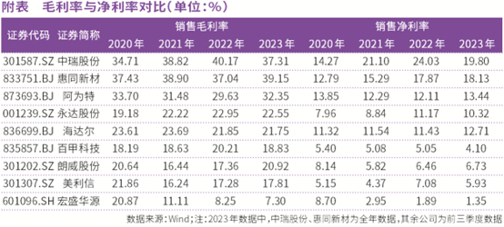 从盈利能力看,中瑞股份相比2023年上市的8家同行业公司,基本面表现相对不错,2020年~2022年,公司销售毛利率和销售净利率不仅持续提高,且两项指标在2022年还是9家公司中最高的,而即便是2023年的数据相比2022年有所下降,也依然处在9家公司的前列(见附表)。