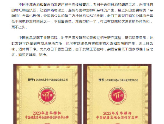 4月1日,衡水老白干官微发文《探秘衡水老白干的健康品质:低杂醇油,不上头》。文章中称,不同于浓香酒和酱香酒发酵过程中需接触窖泥,老白干香型白酒的酿造工艺,采用独特的地缸酿造技艺,让酒体隔绝泥土,避免有害微生物和杂味的产生,且上头的主要物质“杂醇油”含量也极低,经国际公认的第三方检验机构SGS检测,老白干香型白酒的杂醇油含量低于国家标准的四分之一,不到酱香型、浓香型的一半,可以有效减轻饮酒者的身体负担,更不上头。