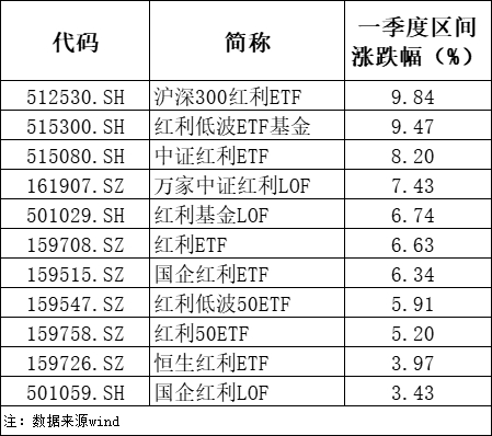 wind数据显示,多只红利主题基金中一季度涨幅最高的是沪深300红利ETF,涨9.84%,收益率最低的是国企红利LOF,涨3.43%。