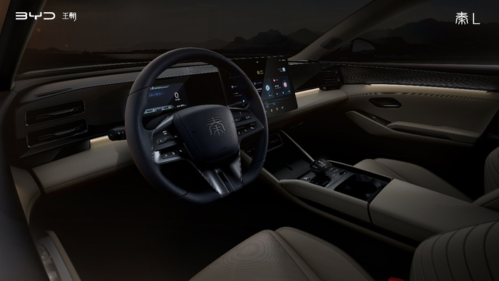 秦L内饰设计灵感来源于传统文化中国山水画,据比亚迪官方介绍,秦L 搭载“山水画境座舱”。中控台采用整体式设计,液晶仪表、云窗扇叶出风口,融合在一块卷轴长屏上,营造出不俗的意境。