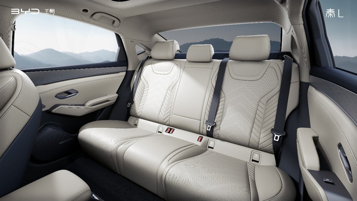 后排座椅颜值在线、坐感舒适支撑到位。配合2790mm的轴距,使得秦L拥有不俗的舒适性和空间感。