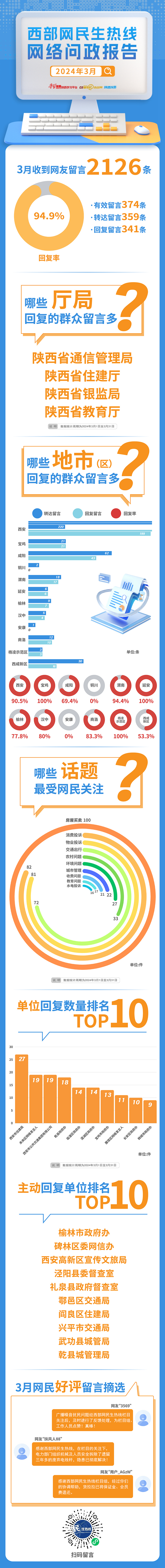 2024年3月,西部网民生热线收到网友留言2126条,其中符合受理条件的网友留言374条。栏目组向陕西省、市、县(区)各有关部门单位转办359条网友留言,其中341条留言已办结回复,整体回复率为94.9%。