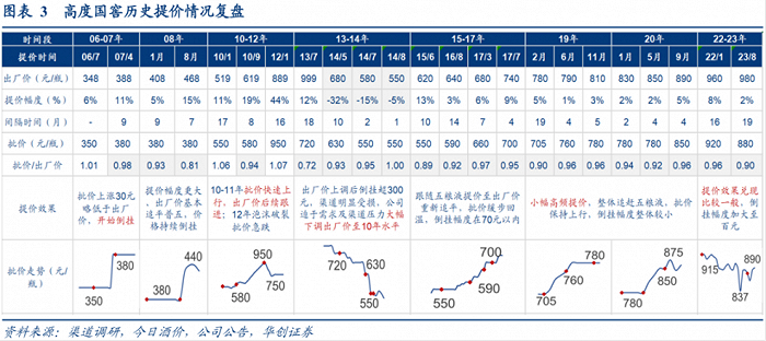 华创证券研报提到,泸州老窖提价间隔期较短,早年提价幅度更高,出厂价一度高于茅五,近年更多采取跟随提价策略,因此提价幅度上前高后低(2015年之后提价幅度在10%以内),批价走势主要跟随普五波动。