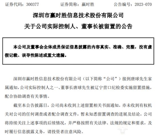 值得关注的是,2023年12月18日,赢时胜发布了一则关于公司实际控制人、董事长被留置的公告。公司表示接到唐球先生家属通知,公司实际控制人之一、董事长唐球被辽宁营口纪 检委实施留置措施,配合协助调查有关事情。