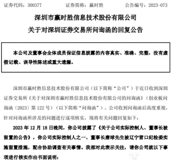 之后深交所也向赢时胜发布了问询函,询问唐球是否涉及行贿事项以及公司后续事务安排。赢时胜于12月22日回复是经公司向唐球家属核实,唐球被采取留置措施的原因是配合协助调查有关事情。