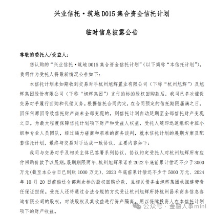 直播中刷屏的负面评论,大多与兴业信托旗下展期兑付产品“筑地D015(旭辉杭州新塘)集合资金信托计划”(以下简称“筑地D015”)相关。