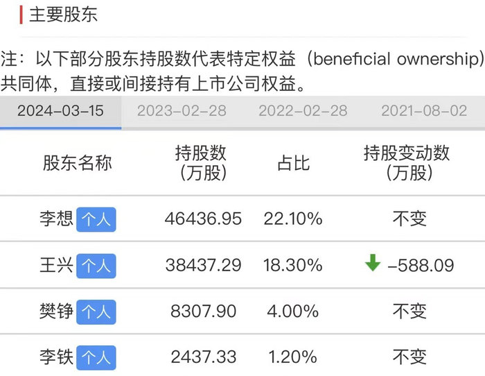 4月3日,据港交所权益披露,王兴于2024年3月26至28日连续三个交易日减持理想汽车,合共减持该公司416.23万股,持股比例由21.76%降至21.53%。