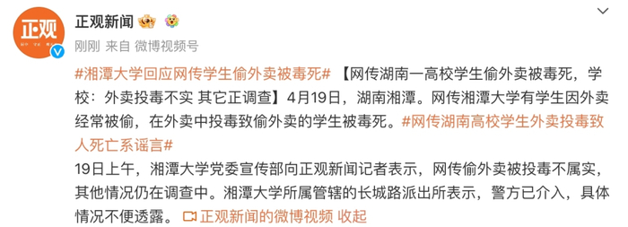 4月19日,网传湖南湘潭大学有学生因外卖经常被偷,在外卖中投毒致偷外卖的学生被毒死的事情。网传湖南高校学生外卖投毒致人死亡系谣言19日上午,湘潭大学党委宣传部向记者表示,网传偷外卖被投毒不属实,其他情况仍在调查中。湘潭大学所属管辖的长城路派出所表示,警方已介入,具体情况不便透露。