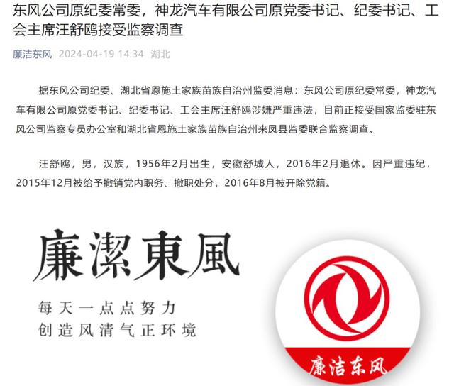 4月19日,据东风公司纪委、湖北省恩施土家族苗族自治州监委消息:东风公司原纪委常委,神龙汽车有限公司原党委书记、纪委书记、工会主席汪舒鸥涉嫌严重违法,目前正接受国家监委驻东风公司监察专员办公室和湖北省恩施土家族苗族自治州来凤县监委联合监察调查。