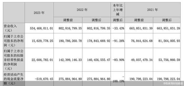 营收下滑超三成、盈利下滑超九成,这是传智教育交出的2023年财报。4月19日,传智教育举办2023年度网上业绩说明会,针对业绩下滑原因作出说明。减少的学生人数、退租的校区和业务调整带来的资产减值,都成为传智教育业绩表现不佳的决定因素。下滑的业绩也导致传智教育2023年计划发行的可转债融资折戟。作为首个A股IPO上市的教育公司,传智教育近两年正完成从职业培训机构到学历职业教育学校的转身,但从业绩表现来看,兴办职教学校并未在当下为其带来更多盈利。对此,传智教育也表态将放缓业务扩张的步伐,同时进一步开源节流,提升运营效率。
