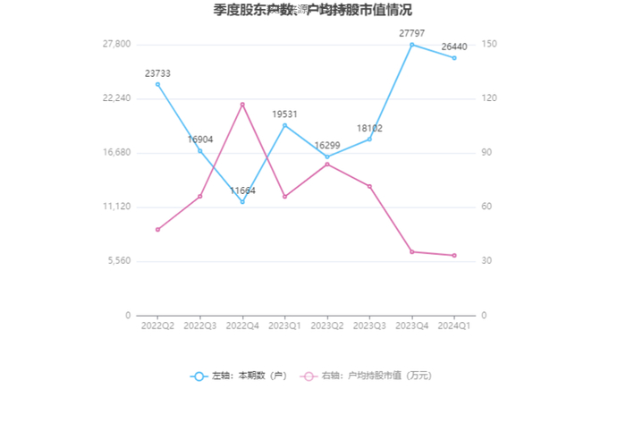 筹码集中度方面,截至2024年一季度末,公司股东总户数为2.64万户,较上年末下降了1357户,降幅4.88%;户均持股市值由上年末的35.32万元下降至33.37万元,降幅为5.52%。
