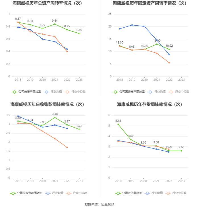 营运能力方面,2023年,公司公司总资产周转率为0.69次,上年同期为0.75次(2022年行业平均值为0.44次,公司位居同行业4/25);公司应收账款周转率、存货周转率分别为2.72次、2.60次。
