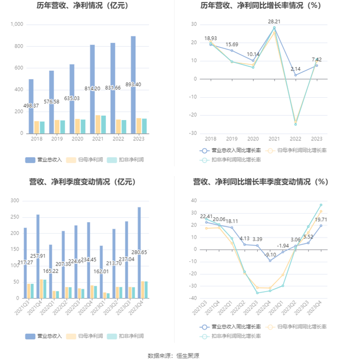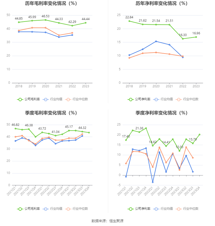 2023年,公司毛利率为44.44%,同比上升2.15个百分点;净利率为16.96%,较上年同期上升0.66个百分点。从单季度指标来看,2023年第四季度公司毛利率为43.54%,同比上升1.41个百分点,环比下降0.78个百分点;净利率为20.16%,较上年同期上升2.31个百分点,较上一季度上升4.37个百分点。