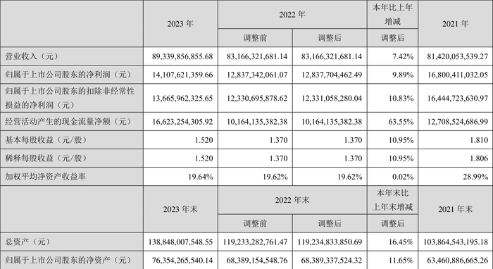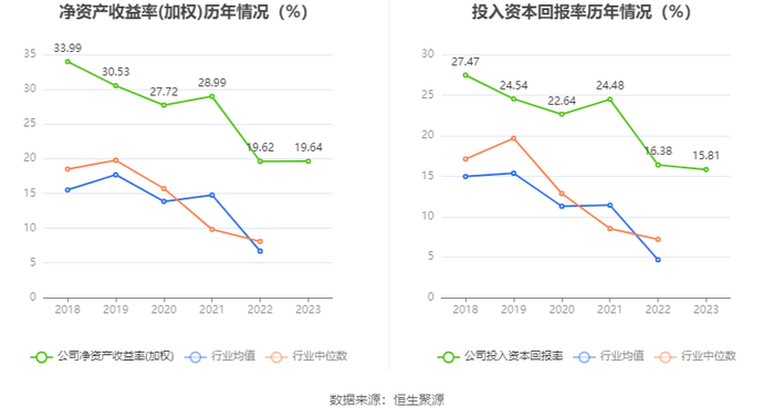 数据显示,2023年公司加权平均净资产收益率为19.64%,较上年同期增长0.02个百分点;公司2023年投入资本回报率为15.81%,较上年同期下降0.57个百分点。