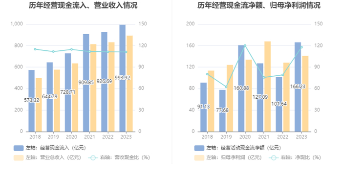 2023年,公司经营活动现金流净额为166.23亿元,同比增长63.55%;筹资活动现金流净额-31.45亿元,同比减少16.90亿元;投资活动现金流净额-39.87亿元,上年同期为-37.25亿元。
