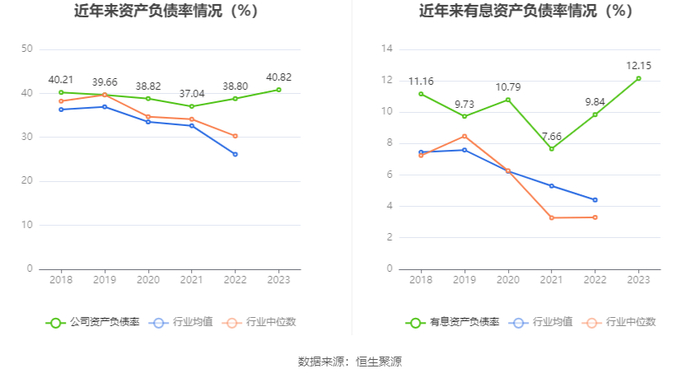 在偿债能力方面,公司2023年年末资产负债率为40.82%,相比上年末上升2.02个百分点;有息资产负债率为12.15%,相比上年末上升2.31个百分点。