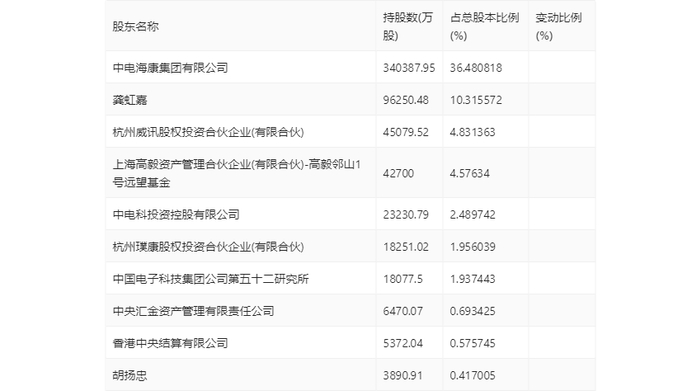 年报显示,2023年年末公司十大流通股东中,持股最多的为中电海康集团有限公司,占比36.48%。十大流通股东名单相比2023年三季报维持不变。在具体持股比例上,香港中央结算有限公司持股有所上升,上海高毅资产管理合伙企业(有限合伙)-高毅邻山1号远望基金持股有所下降。