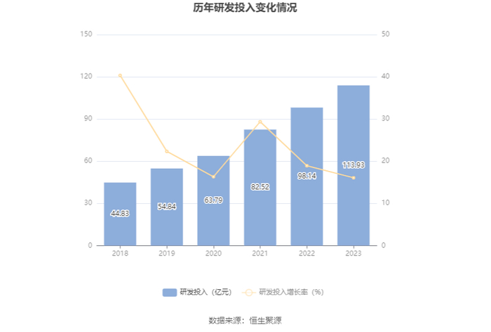 2023年全年,公司研发投入金额为113.93亿元,同比增长16.08%;研发投入占营业收入比例为12.75%,相比上年同期上升0.95个百分点。此外,公司全年研发投入资本化率为0。