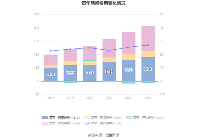 2023年,公司期间费用为242.55亿元,较上年同期增加30.16亿元;期间费用率为27.15%,较上年同期上升1.61个百分点。其中,销售费用同比增长10.94%,管理费用同比增长4.83%,研发费用同比增长16.08%,财务费用由去年同期的-9.90亿元变为-7.50亿元。