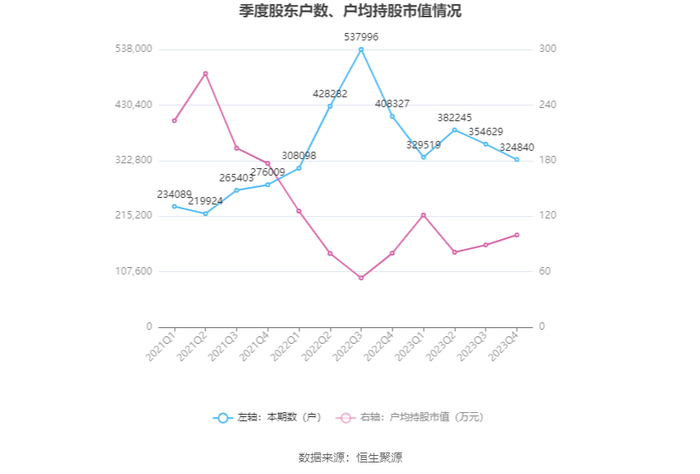筹码集中度方面,截至2023年年末,公司股东总户数为32.48万户,较三季度末下降了2.98万户,降幅8.40%;户均持股市值由三季度末的88.93万元上升至99.73万元,增幅为12.14%。