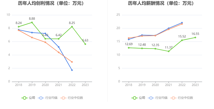 截至2023年末,公司员工总数为1298人,人均创收64.91万元,人均创利5.63万元,人均薪酬16.55万元,较上年同期分别变化-1.13%、-31.72%、6.64%。