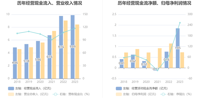 2023年,公司营业收入现金比为117.34%,净现比为253.35%。