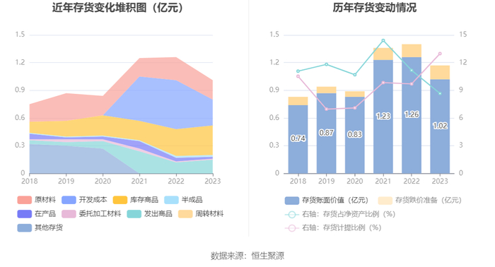 从存货变动来看,截至2023年年末,公司存货账面价值为1.02亿元,占净资产的8.66%,较上年末减少2419.34万元。其中,存货跌价准备为1518.57万元,计提比例为12.98%。
