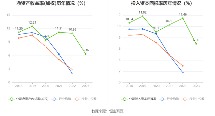 数据显示,2023年公司加权平均净资产收益率为6.36%,较上年同期下降4.60个百分点;公司2023年投入资本回报率为6.90%,较上年同期下降4.56个百分点。
