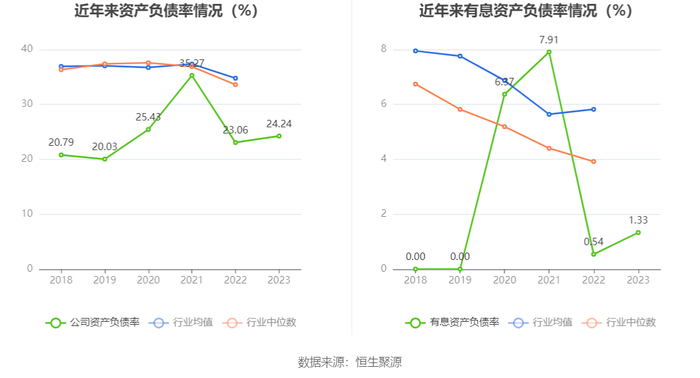 在偿债能力方面,公司2023年年末资产负债率为24.24%,相比上年末上升1.18个百分点;有息资产负债率为1.33%,相比上年末上升0.79个百分点。