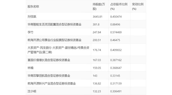 年报显示,2023年年末公司十大流通股东中,新进股东为前海开源公用事业行业股票型证券投资基金、富国价值增长混合型证券投资基金、林楠、华商双擎领航混合型证券投资基金、前海开源新兴产业混合型证券投资基金、沈小明,取代了三季度末的全国社保基金一一四组合、富国新兴产业股票型证券投资基金、华商新兴活力灵活配置混合型证券投资基金、华商新能源汽车混合型证券投资基金、华夏人寿保险股份有限公司-分红-个险分红、香港中央结算有限公司。在具体持股比例上,华商智能生活灵活配置混合型证券投资基金、大家资产-民生银行-大家资产-盛世精选2号集合资产管理产品(第二期)持股有所下降。