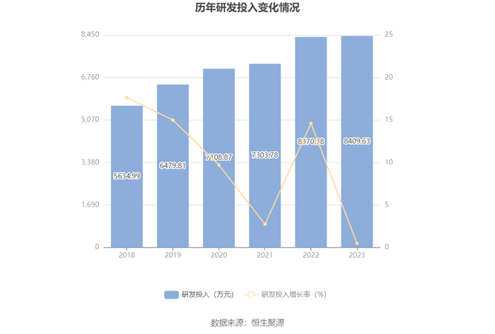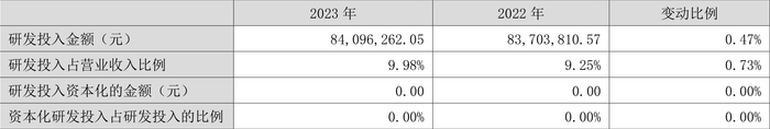 2023年全年,公司研发投入金额为8409.63万元,同比增长0.47%;研发投入占营业收入比例为9.98%,相比上年同期上升0.73个百分点。此外,公司全年研发投入资本化率为0。