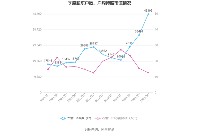 筹码集中度方面,截至2023年年末,公司股东总户数为4.84万户,较三季度末增长了1.29万户,增幅36.35%;户均持股市值由三季度末的15.46万元下降至12.71万元,降幅为17.79%。