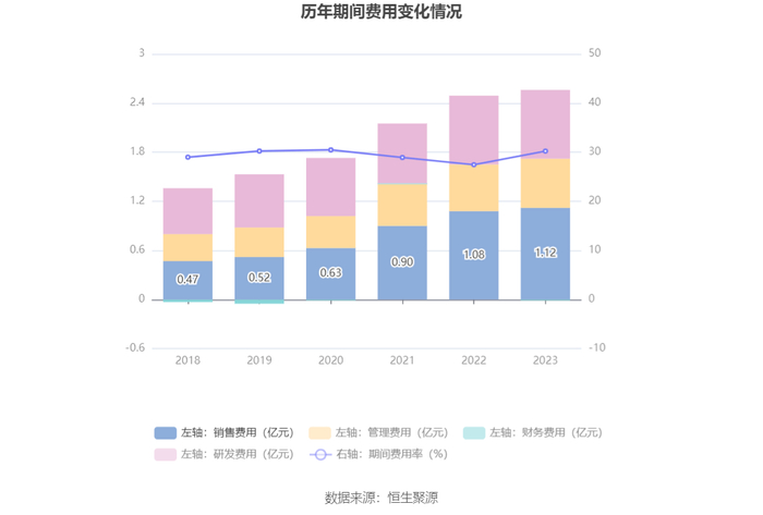 2023年,公司期间费用为2.55亿元,较上年同期增加601.81万元;期间费用率为30.22%,较上年同期上升2.77个百分点。其中,销售费用同比增长3.81%,管理费用同比增长4.85%,研发费用同比增长0.47%,财务费用由去年同期的6.67万元变为-118.00万元。