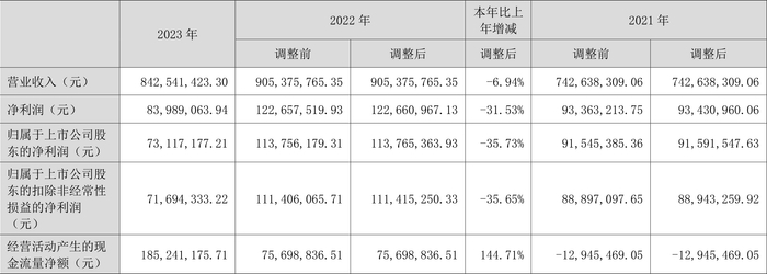 2023年,公司经营活动现金流净额为1.85亿元,同比增长144.71%;筹资活动现金流净额-3449.66万元,同比减少1.00亿元;投资活动现金流净额-3674.22万元,上年同期为-1238.53万元。