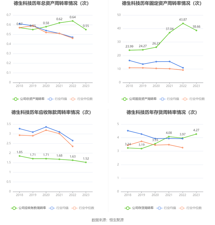 营运能力方面,2023年,公司公司总资产周转率为0.55次,上年同期为0.64次(2022年行业平均值为0.47次,公司位居同行业37/135);固定资产周转率为38.66次,上年同期为43.87次(2022年行业平均值为10.93次,公司位居同行业19/135);公司应收账款周转率、存货周转率分别为1.52次、4.27次。