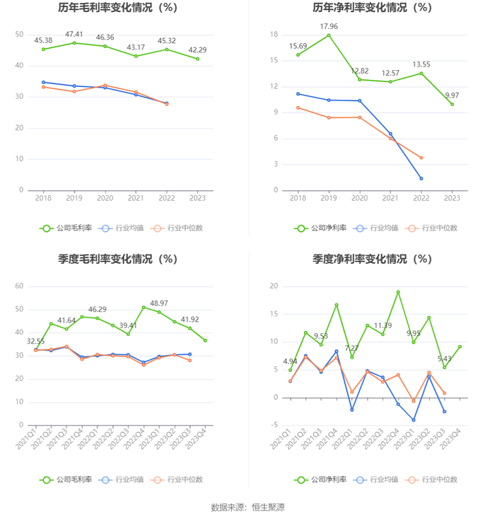 2023年,公司毛利率为42.29%,同比下降3.03个百分点;净利率为9.97%,较上年同期下降3.58个百分点。从单季度指标来看,2023年第四季度公司毛利率为36.67%,同比下降14.33个百分点,环比下降5.25个百分点;净利率为9.17%,较上年同期下降9.85个百分点,较上一季度上升3.74个百分点。
