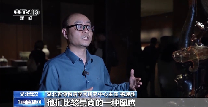 湖北省博物馆学术研究中心主任 杨理胜:第一层是蛇,就是我们所理解的龙,它应该是中原国家或者说周人,他们比较崇尚的一种图腾。中间的虎是巴人的图腾,巴人跟楚人是近邻,上面鸟也叫做凤,是楚人的图腾,所以大家看这一座虎座鸟架鼓成为一个民族大融合,或者说多民族的交往交流交融的生动体现。