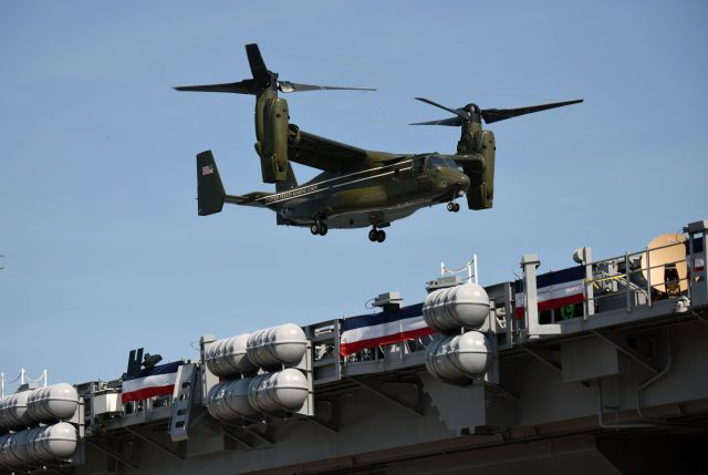 2017年7月22日,在美国弗吉尼亚州诺福克海军基地,一架海军陆战队MV-22B鱼鹰旋翼机降落在“福特”号航母上。新华社记者 殷博古 摄