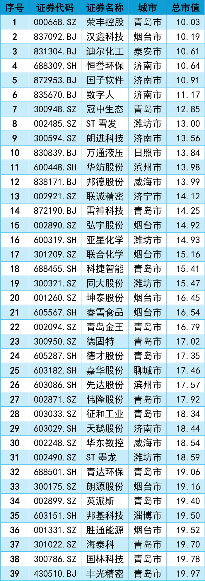 总市值处于10亿元至20亿元区间的山东公司,共有39家。