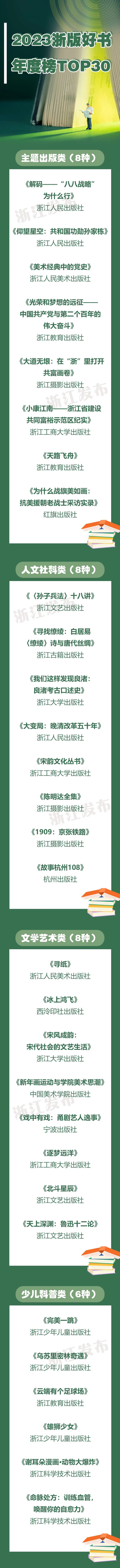 4月19日,2024年浙江省全民阅读系列活动正式启动。由中共浙江省委宣传部、浙江省新闻出版局组织推荐的“2023浙版好书年度榜TOP30”结果揭晓,其中主题出版类8种,人文社科类8种,文学艺术类8种,少儿科普类6种。