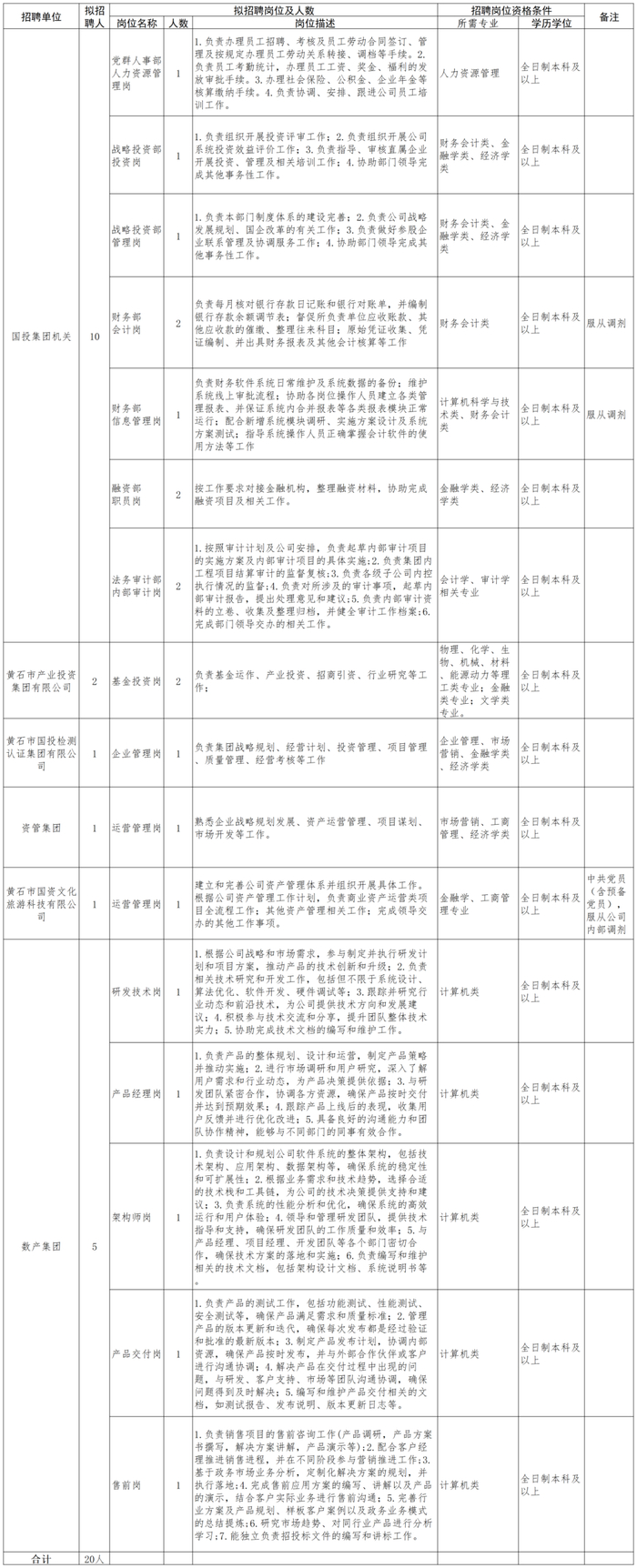 本次招聘信息在黄石人才网、黄石国投集团微信公众号、黄石市人才市场公司微信公众号等均有发布。