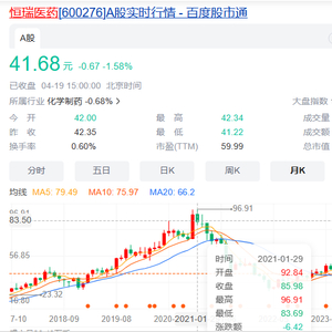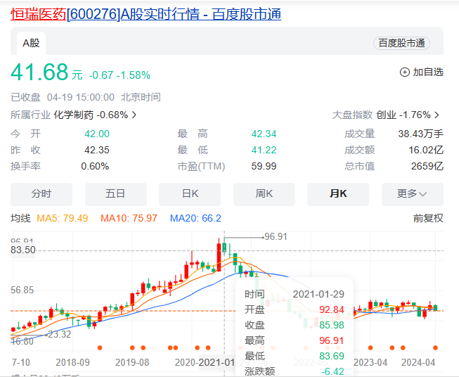 有意思的是,这两天恒瑞医药的股价不涨反跌。截至4月19日收盘,恒瑞医药收于41.68元/股,4月18日—19日,两个交易日累计下跌6.18%。