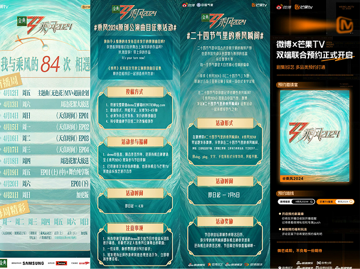 随后,又推出了#乘风2024原创公演曲目征集活动#以及#二十四节气里的乘风瞬间#打卡活动,同时与微博合作开启双端联合预约。