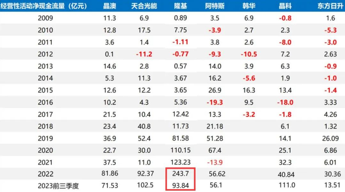 隆基绿能2023年度和今年一季度的业绩表现究竟如何?投资者们都在等着靴子落地。赶碳号在此不敢妄自揣测,但有一点,2023年前三季度,隆基绿能的经营性活动净现金流量和2022年相比,出现了重大变化。