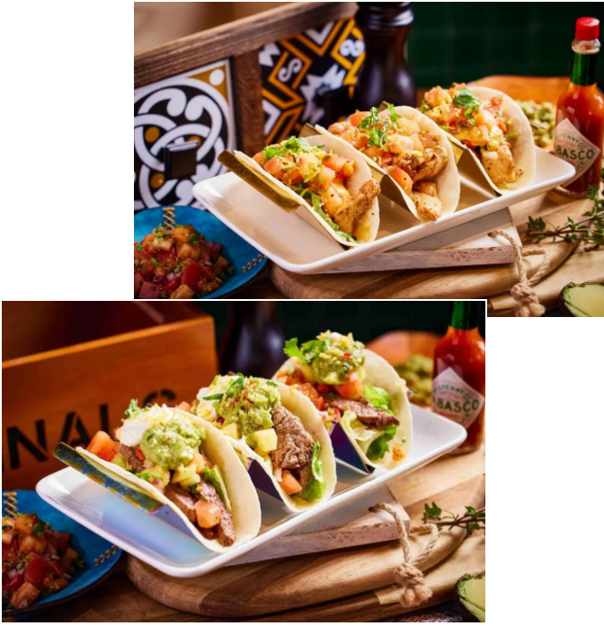 主张健康、时尚、天然的HFFOUSA弗萨塔可墨西哥餐厅,他们的塔可统统都是精选食材。他们带来的鸡、牛两款塔可:坎昆鸡肉塔可,是精选优质鸡胸肉;而牛排肉塔可,则是选取S级牛里脊。另外也有专为素食朋友准备的牛油果全素塔可,自制的牛油果酱,搭配生菜,以及柠檬汁拌制的莎莎酱。